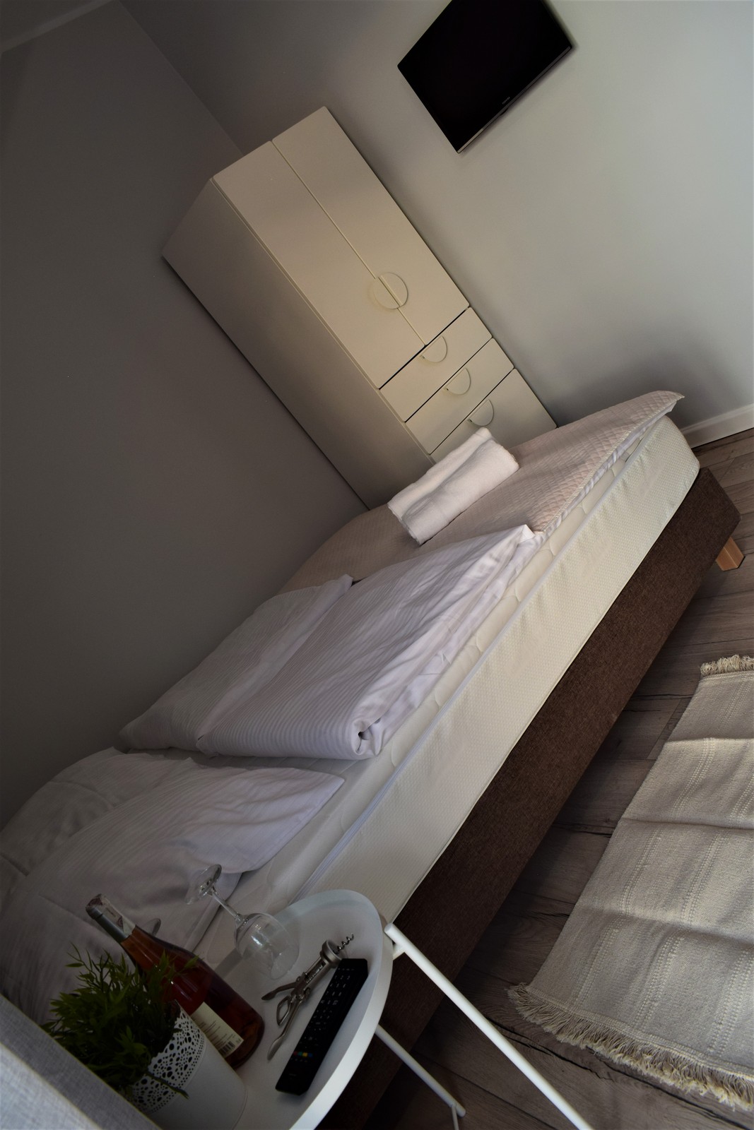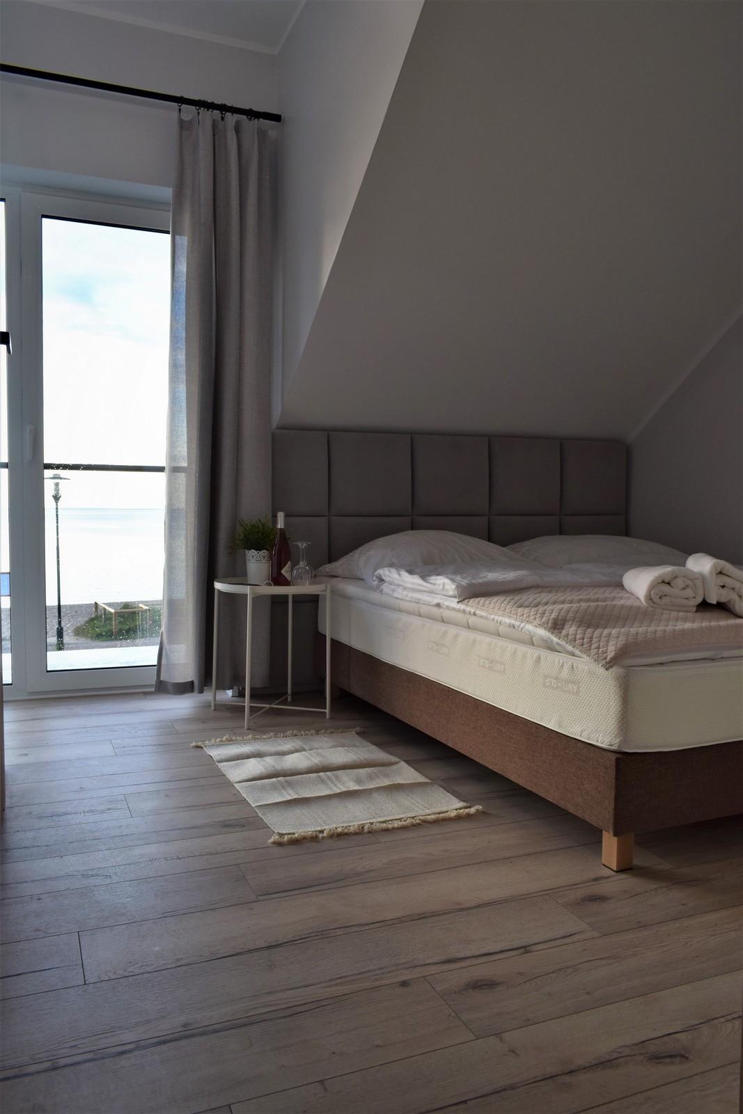 Pokój na 1 piętrze budynku, wychodzący na północ. Roztacza się z niego przepiękny widok na zatokę pucką oraz rewski cypel. Wnętrze pokoju jest jasne i przytulne. Pokój jest przeznaczony dla 1-2 osób. W pokoju znajdują się komfortowe łóżka 2x 80x200cm, które po złączeniu dają powierzchnię spania 160x200cm. Wewnątrz znajduje się szafa, telewizor, internet bezprzewodowy (WiFi), lodówka oraz e-zestaw do parzenia kawy i herbaty.
