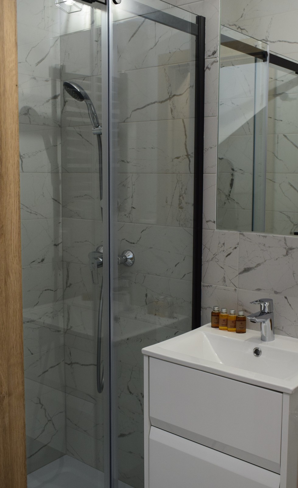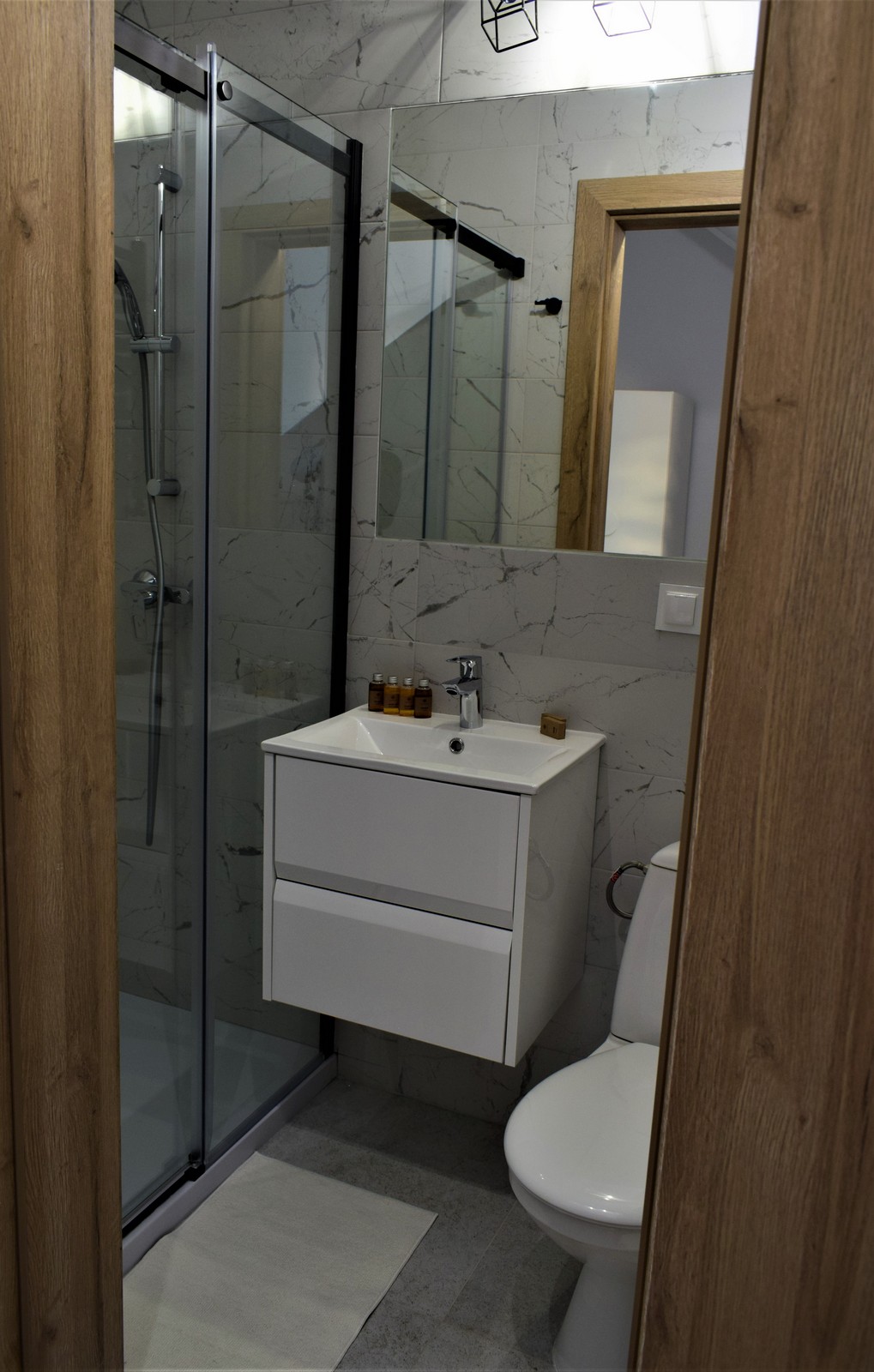 Łazienka wyposażona jest w prysznic, umywalkę, WC, lustro, ręczniki oraz zestaw niezbędnych kosmetyków (szampon, mydło). Na balkonie znadują się krzesełka oraz stolik kawowy.