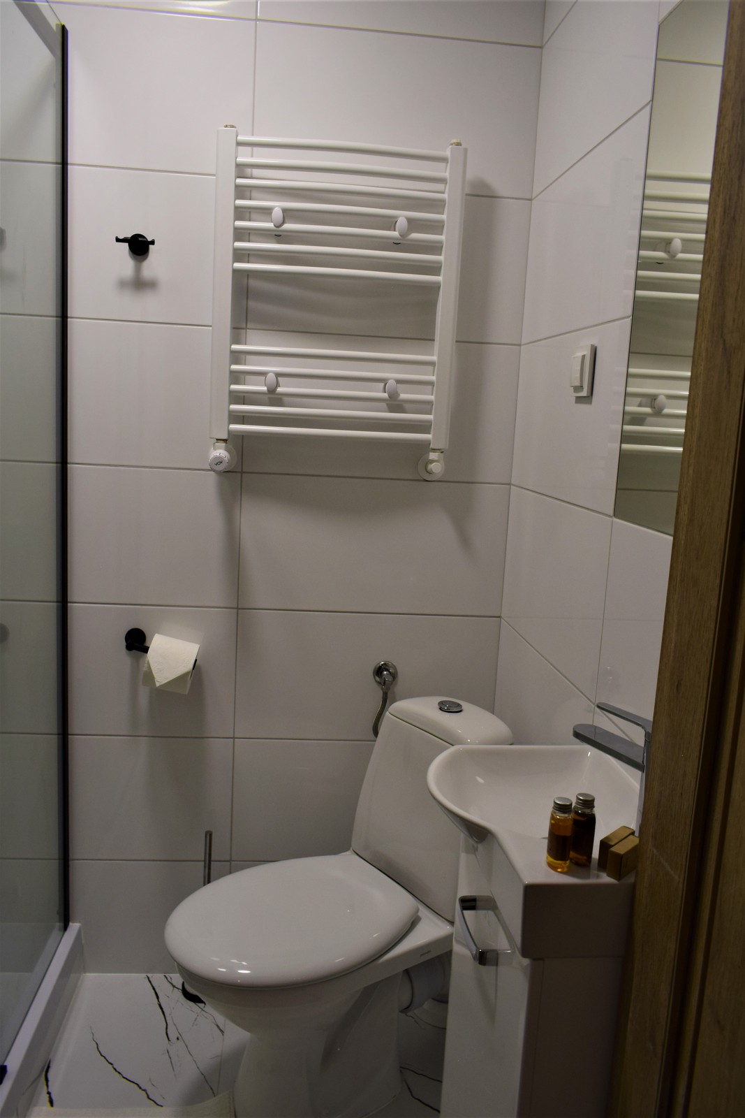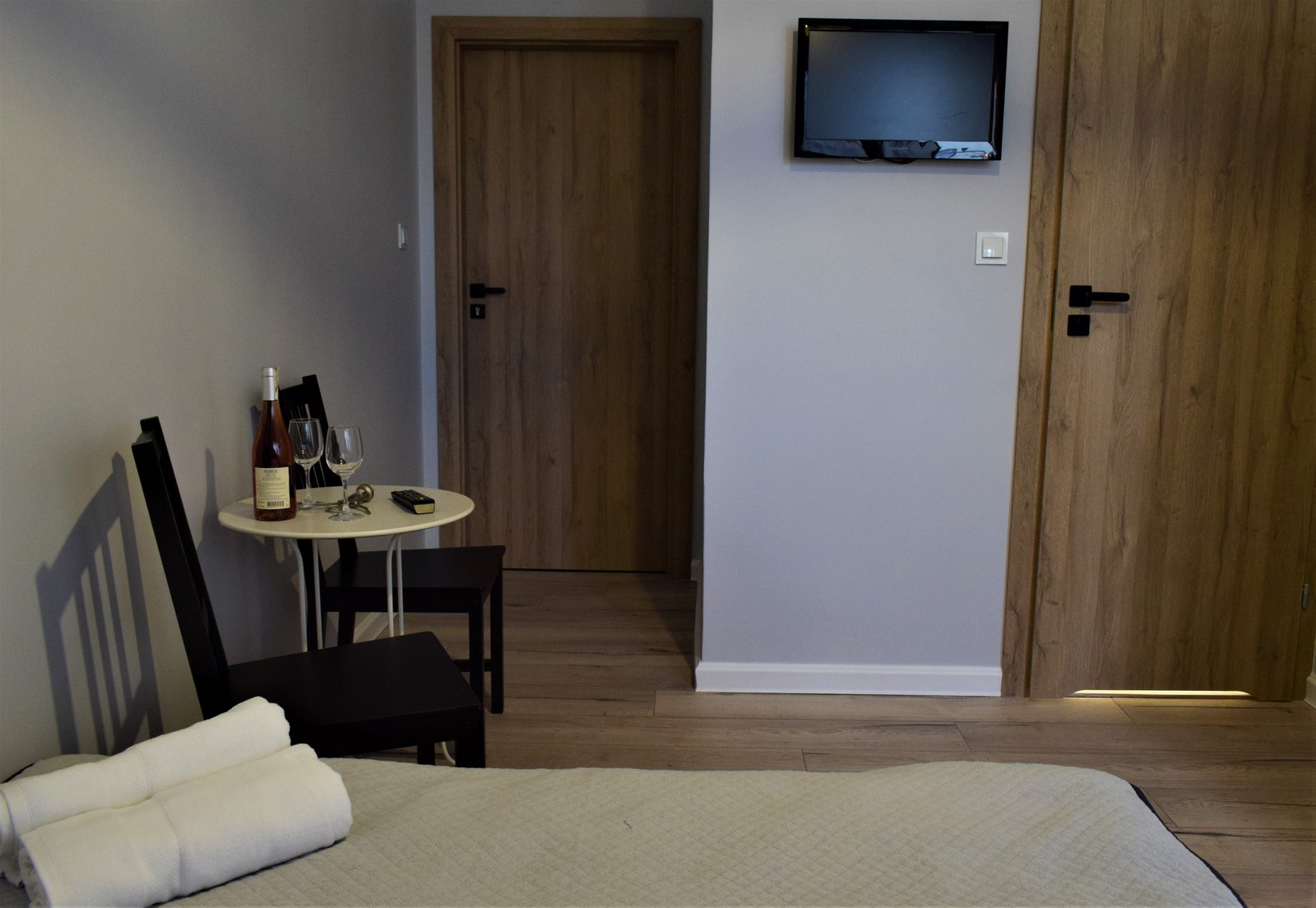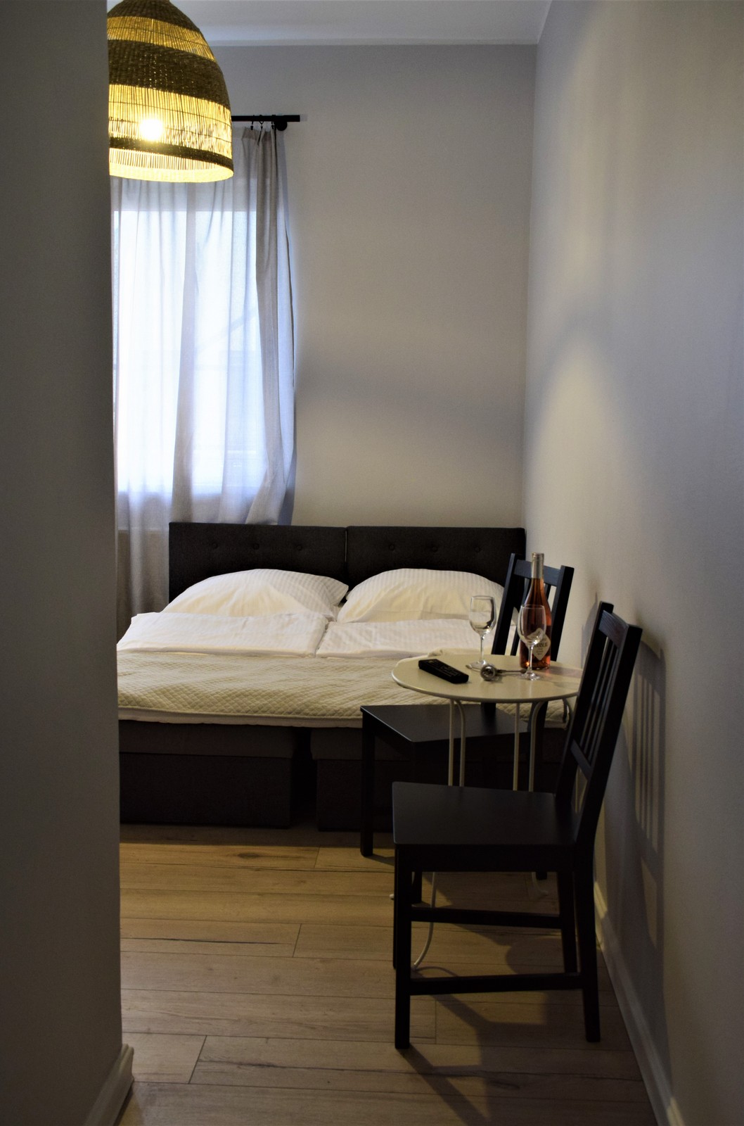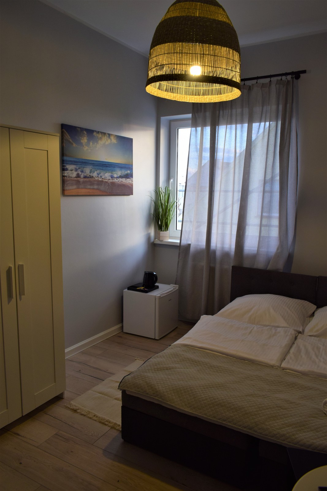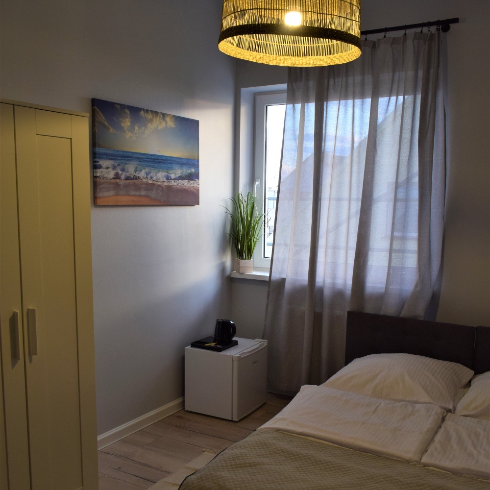 Nieduży ok 12 m² ale przytulny pokój dla 1-2 osób na 1 piętrze budynku, wychodzący na zachód. W pokoju znajdują się dwa łóżka 80x200cm, które można łączyć bądź rozdzielać. Ponadto jest stolik kawowy, krzesełka, szafa, telewizor, internet bezprzewodowy (WiFi), lodówka, czajnik, kawa, herbata. Łazienka wyposażona jest w prysznic, umywalkę, WC, lustro, ręczniki oraz zestaw niezbędnych kosmetyków (szampon, mydło).