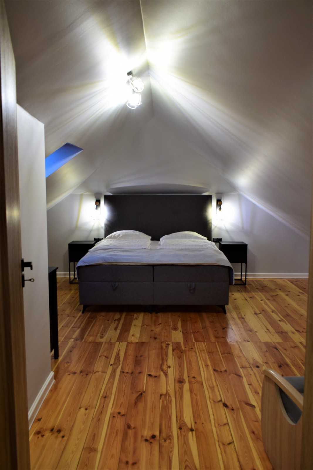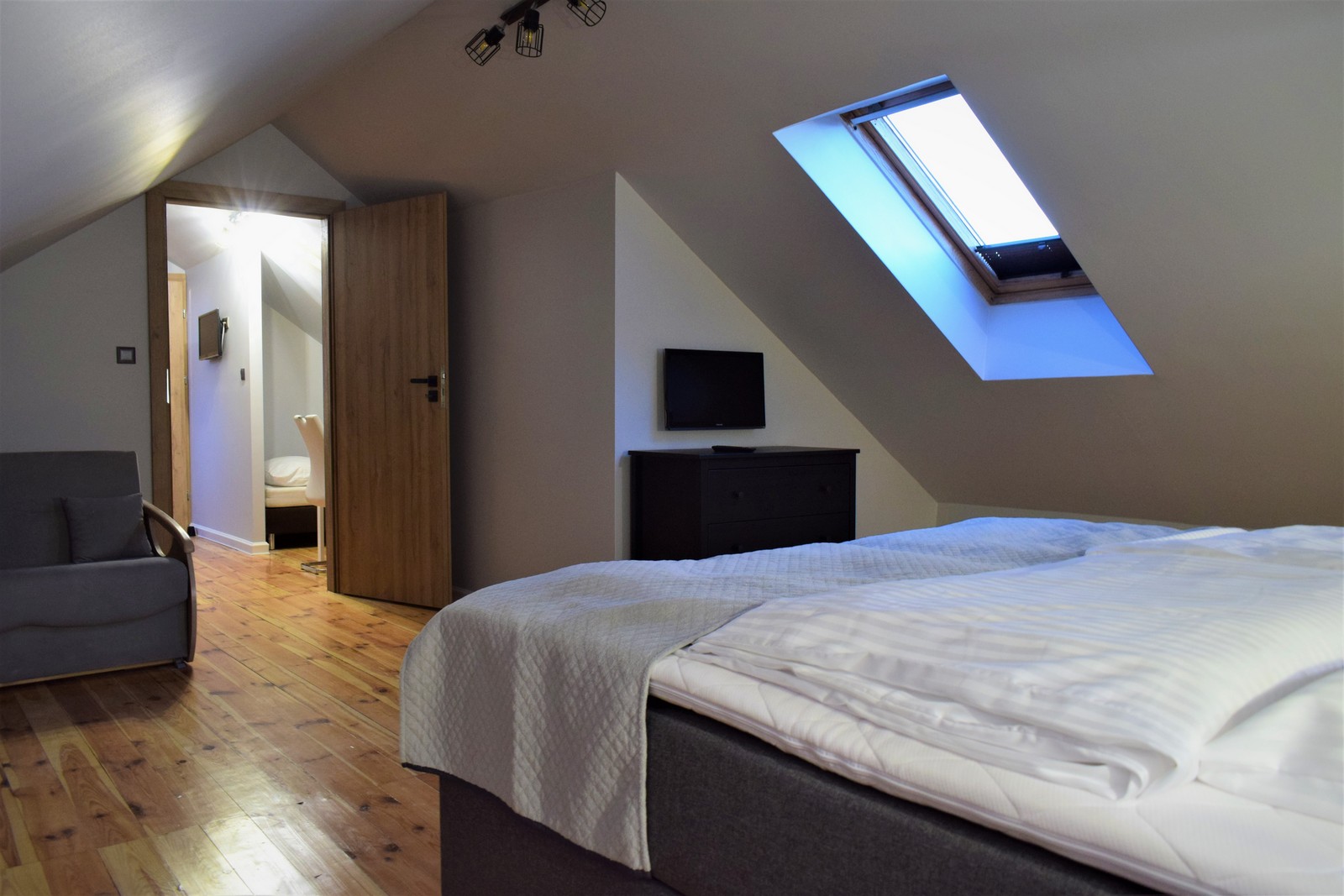 Komfortowe i przestronne studio na poddaszu, wychodzące na południe. Składa się z dużej sypialni z łóżkiem małżeńskim typu king (180x200 cm) oraz pojedynczego rozkładanego fotela o powierzchni spania 120x200 cm. W sypialni znajduje się również szafa, komoda oraz telewizor. W drugim pomieszczeniu znajduje się sofa z funkcją spania (160x200 cm), a za dodatkową ścianką ukryte jest łóżko o wymiarach 80x200 cm.